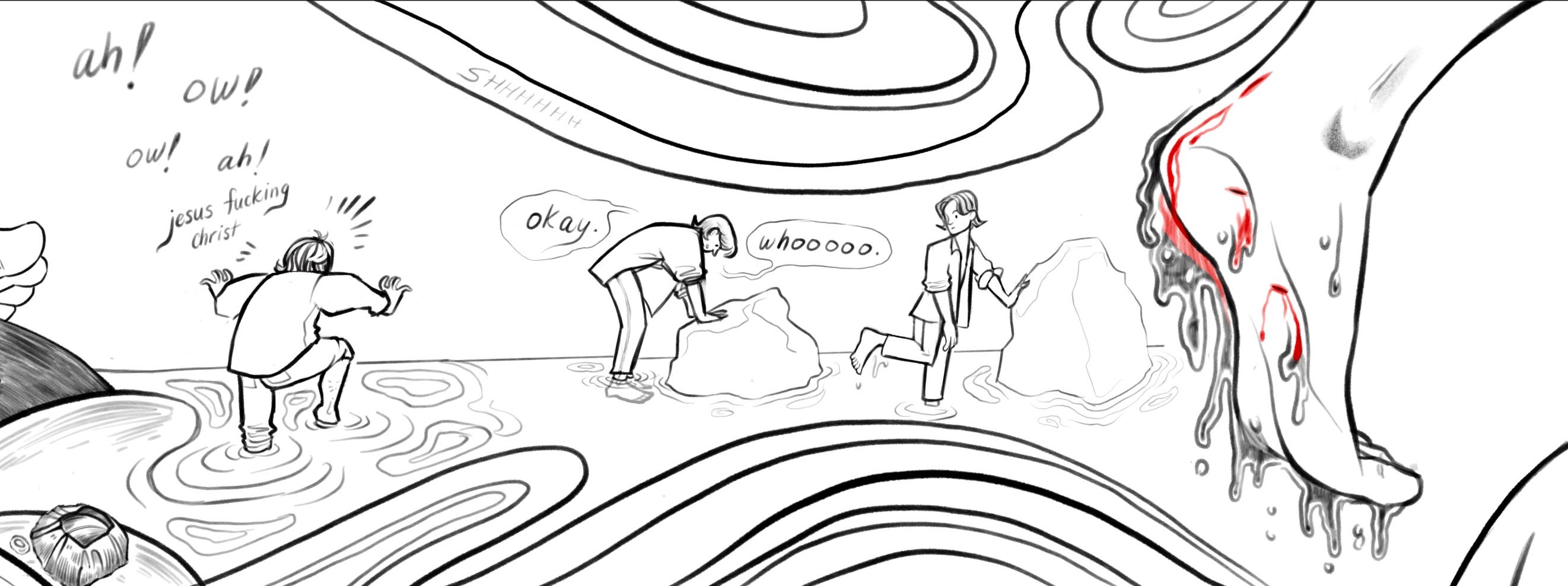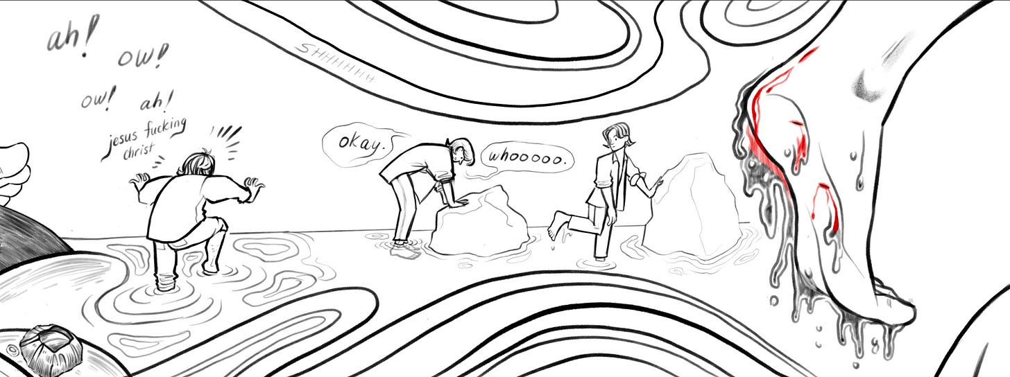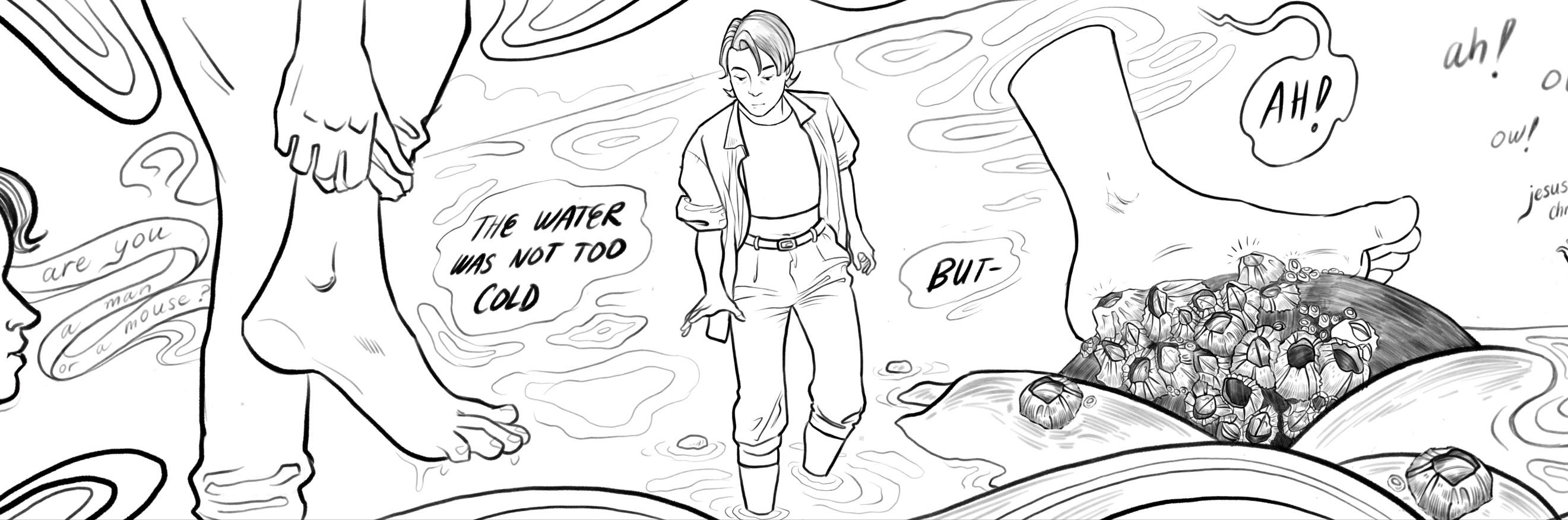 The comic’s still not done but it’s getting there. There are no pages and and no panels. When finished, it will be made into a zine using the meander accordion fold.